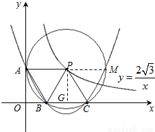 ),过点P作PG⊥BC于G,则半径PB=PC,由菱形的性质得PC=BC,可知△PBC为等边三角形,在Rt△PBG中,∠PBG=60°,PB=PA=x,PG=