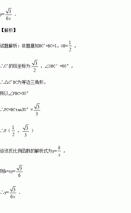 如图,把面积为1的正方形纸片ABCD放在平面直角坐标系中,点B、C在x轴上,A、D和B、C关于y轴对称将C点折叠到y轴上的C′处,折痕为BP,现有一反比例函数的图象经过P点,则该反比例函数的解析式为 .