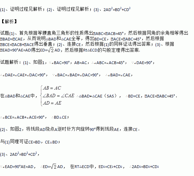 £¨1£©Èçͼ1£¬µ±µãDÔÚÏß¶ÎBCÉÏʱ£¬½«Ïß¶ÎADÈÆµãAÄæÊ±Õë·½ÏòÐýת90¡ãµÃµ½Ïß¶ÎAE£¬Á¬½ÓCE£®ÇóÖ¤£ºBD=CE£¬BD¡ÍCE£»