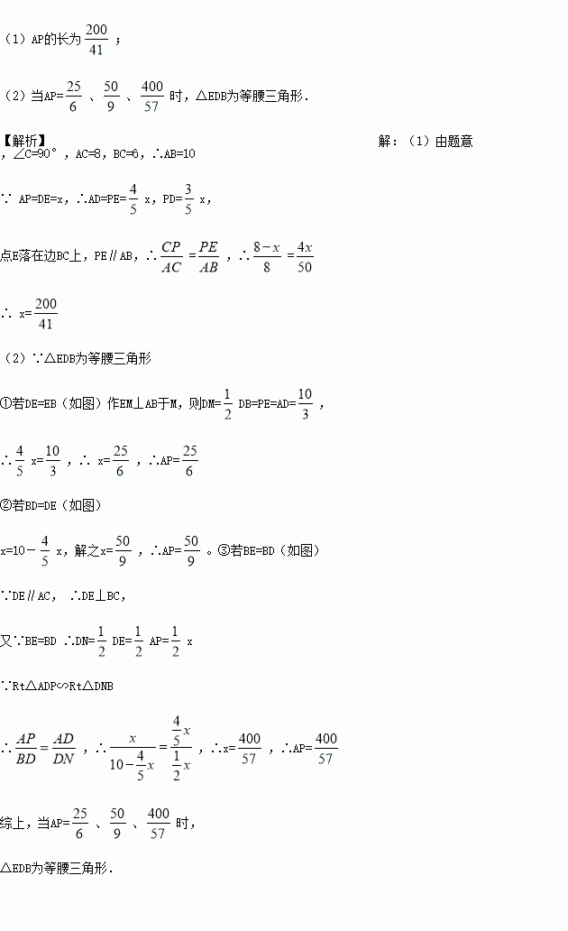 如图,在△ABC中,∠C=90°,AC=8,BC=6,P是AC上一点,过P作PD⊥AB于点D,将△APD绕PD的中点旋转180°得到△EPD.(设AP=x)