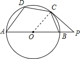 解答 解:连接OC,如右图所示,由题意可得,∠OCP=90°,∠P=40°,∴∠COB=50°,∵OC=OB,∴∠OCB=∠OBC=65°,∵四边形ABCD是圆内接四边形,∴∠D+∠ABC=180°,∴∠D=115°,故答案为:115°.