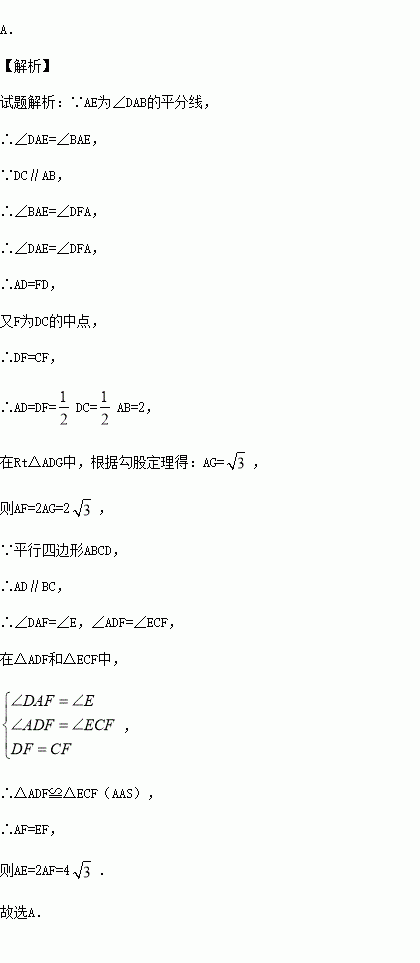 如图,在平行四边形ABCD中,AB=4,∠BAD的平分线与BC的延长线交于点E,与DC交于点F,且点F为边DC的中点,DG⊥AE,垂足为G,若DG=1,则AE的边长为( )
