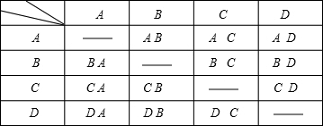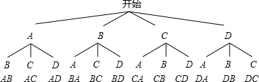 (1)用画树状图或列表法表示抽取两张卡片可能出现的所有情况(卡片可用A、B、C、D表示);