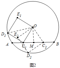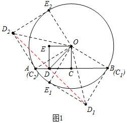 分析 如图1中,点D运动的轨迹是线段D1D2,分别在RtODD1和Rt△ODD2中,求出DD1,DD2即可.如图2中,作OM⊥AB于M,分别求出AC1,AC2即可解决问题.