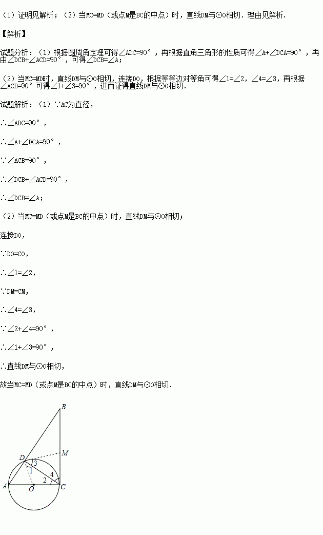 (2)若M为线段BC上一点,试问点M在什么位置时,直线DM与⊙O相切?并说明理由。