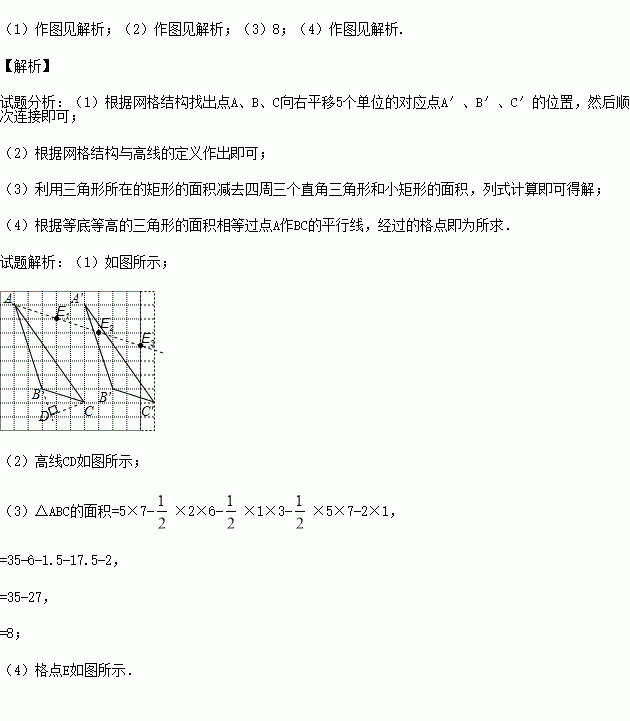 (4)△ABC与△EBC面积相等,在图中描出所有满足条件且异于A点的格点E,并记为E1E2E3.
