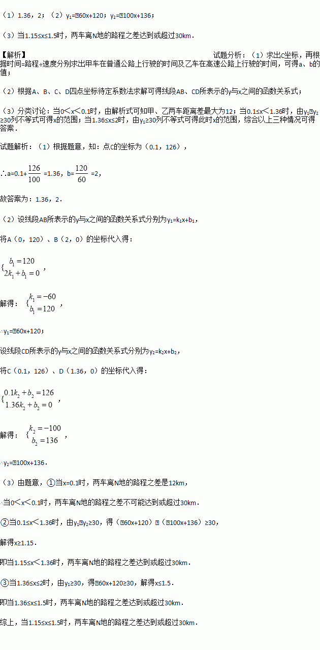 (本题满分10分)从M地到N地有一条普通公路,总路程为120km;有一条高速公路,总路程为126km.甲车和乙车同时从M地开往N地,甲车全程走普通公路,乙车先行驶了另一段普通公路,然后再上高速公路.假设两车在普通公路和高速公路上分别保持匀速行驶,其中在普通公路上的行车速度为60km/h,在高速公路上的行车速度为100km/h.设两车出发x h时,距N地的路程为y km,图中的线段AB与折线ACD分别表示甲车与乙车的y与x之间的函数关系.