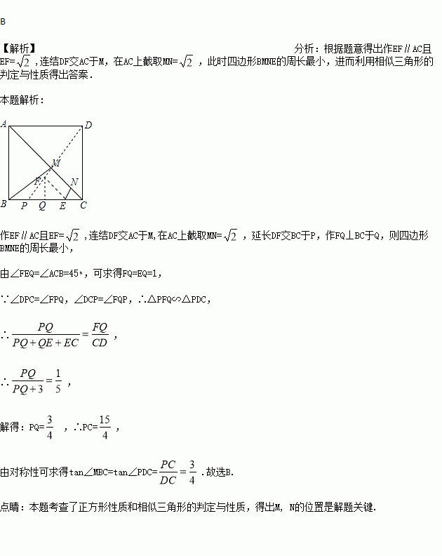 的线段MN在AC上运动,当四边形BMNE的周长最小时,则tan∠MBC的值是( )