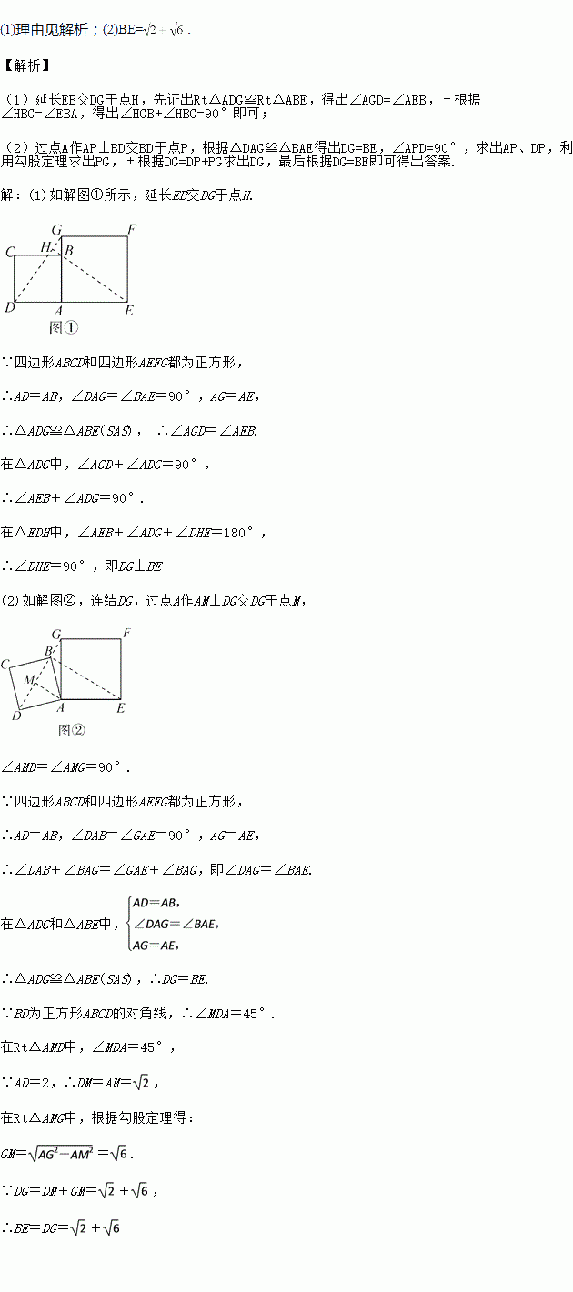 (2)如图2,小明将正方形ABCD绕点A逆时针旋转,当点B恰好落在线段DG上时,请你帮他求出此时BE的长.