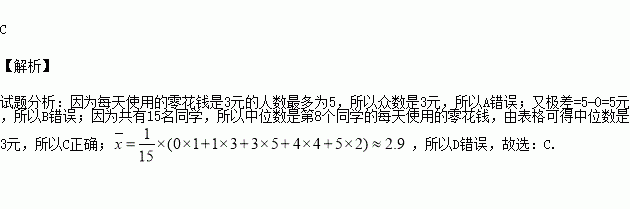 为了解某班学生每天使用零花钱的情况,小明随机调查了15名同学,结果如下表: