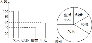 分析 (1)用借“生活”类的书的人数除以它所占的百分比即可得到调查的总人数;然后用360°乘以借阅“艺术“的人数所占的百分比得到“艺术”部分的圆心角度;
