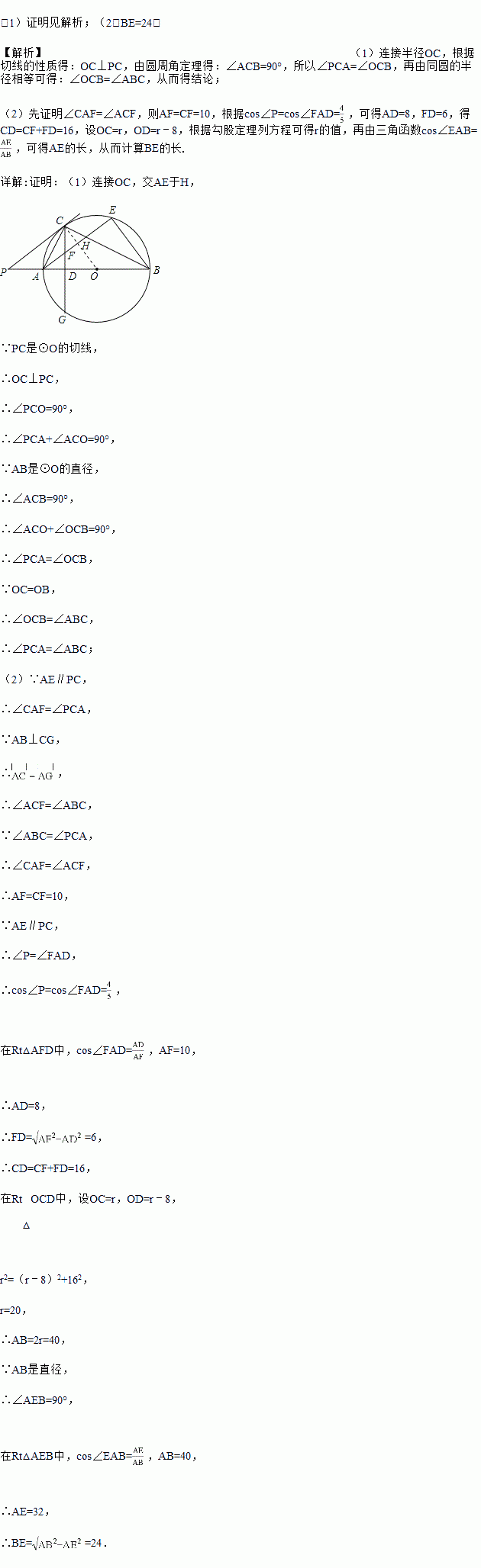 (2)过点A作AE∥PC交⊙O于点E,交CD于点F,连接BE,若cos∠P=