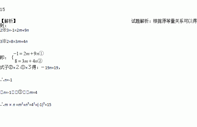 定义一种新的运算“※” ,规定:x ※ y = mx+ny2,其中m、n为常数,已知2 ※ 3 = -1,3 ※ 2 = 8,则m ※ n =_______ 。