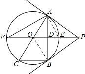 分析 (1)连接OB,由OP垂直于AB,利用垂径定理得到D为AB的中点,即OP垂直平分AB,可得出AP=BP,再由OA=OB,OP=OP,利用SSS得出三角形AOP与三角形BOP全等,由PB为圆的切线,得到OB垂直于BP,利用全等三角形的对应角相等及垂直的定义得到OA垂直于AP,即PA为圆O的切线;