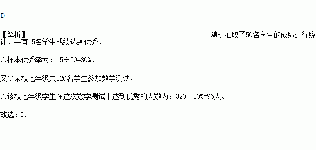 某校七年级共 320名学生参加数学测试,随机抽取50名学生的成绩进行统计,其中15名学生成绩达到优秀,估计该校七年级学生在这次数学测试中达到优秀的人数大约有( )