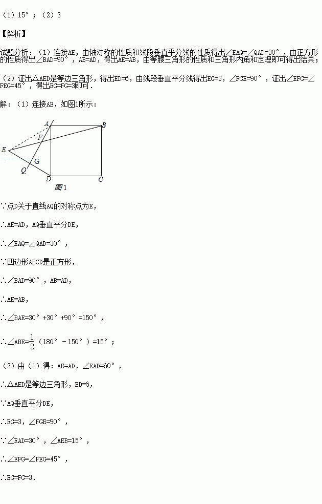 (2015秋•江阴市期中)在小学,我们已经初步了解到,正方形的每个角都是90°,每条边都相等.如图,在正方形ABCD外侧作直线AQ,且∠QAD=30°,点D关于直线AQ的对称点为E,连接DE、BE,DE交AQ于点G,BE交AQ于点F.