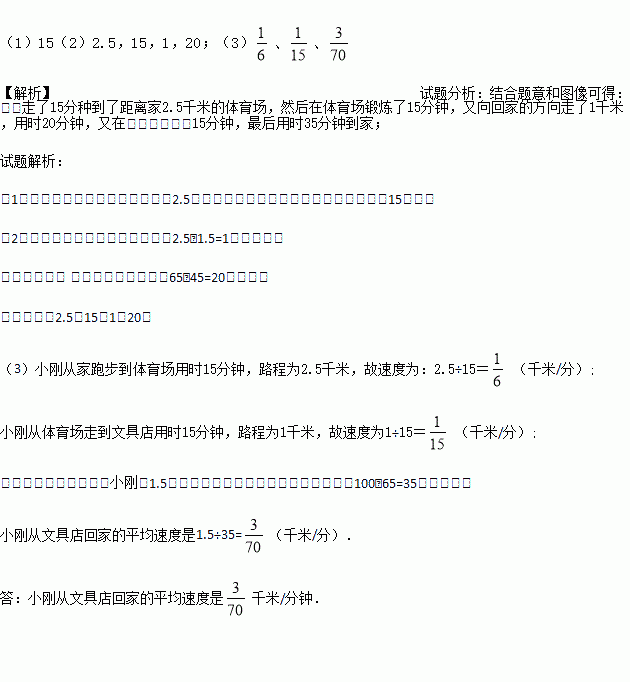 (1)体育场离小刚家 千米,小刚在体育场锻炼了 分钟.
