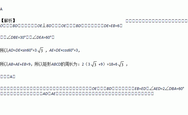 如图,在矩形ABCD中,对角线AC、BD交于点O,OE⊥BD交AB于E,若∠ABD=30°,DE=6,则矩形ABCD的周长为( )