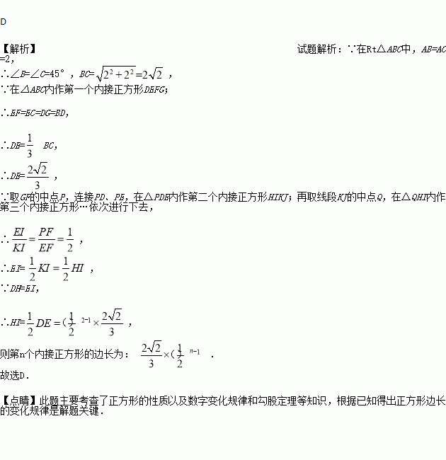 如图,已知在Rt△ABC中,AB=AC=2,在△ABC内作第一个内接正方形DEFG;然后取GF的中点P,连接PD、PE,在△PDE内作第二个内接正方形HIKJ;再取线段KJ的中点Q,在△QHI内作第三个内接正方形…依次进行下去,则第n个内接正方形的边长为( )