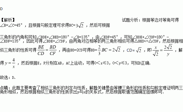 如图,在△ABC中,∠BAC=90°,AB=AC=3,点D在BC上且BD=2CD,E,F分别在AB,AC上运动且始终保持∠EDF=45°,设BE=x,CF=y,则y与x之间的函数关系用图象表示为:( )