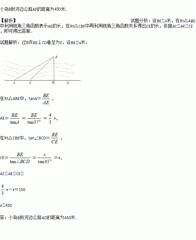 如图,小明要测量河内小岛B到河边公路AD的距离,在点A处测得∠BAD=37°,沿AD方向前进150米到达点C,测得∠BCD=45°. 求小岛B到河边公路AD的距离.