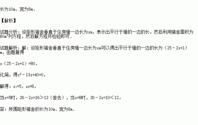 如图,一农户要建一个矩形猪舍,猪舍的一边利用长为12m的住房墙,另外三边用25m长的建筑材料围成,为方便进出,在垂直于住房墙的一边留一个1m宽的门,所围矩形猪舍的长、宽分别为多少时,猪舍面积为80m2?