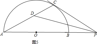 (4)∠CDP的度数不随点P在AB延长线上的位置的变化而变化,如图5,![]()