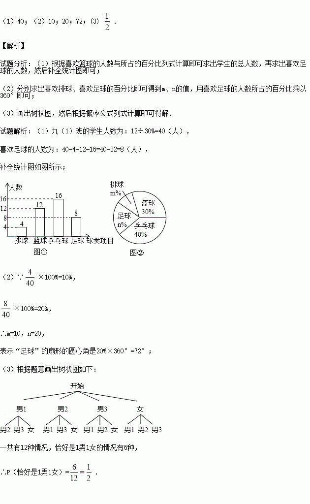 某中学九(1)班为了了解全班学生喜欢球类活动的情况,采取全面调查的方法,从足球、乒乓球、篮球、排球等四个方面调查了全班学生的兴趣爱好,根据调查的结果组建了4个兴趣小组,并绘制成如图所示的两幅不完整的统计图(如图①,②,要求每位学生只能选择一种自己喜欢的球类),请你根据图中提供的信息解答下列问题: