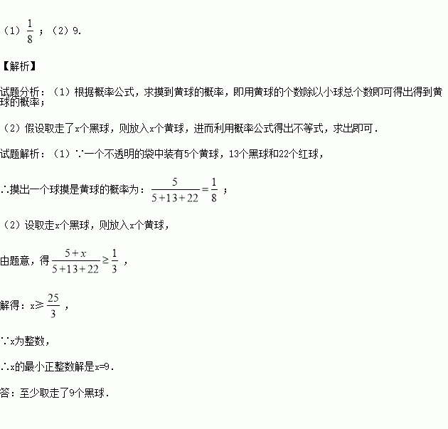 ⑵.现在从袋中取出若干个黑球,并放入相同数量的黄球,搅拌均匀后使从袋中摸出一个黄球的概率不小于