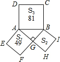 分析:根据直角三角形的勾股定理以及正方形的面积公式,不难发现:S3-S1=S2.根据题意可得出S1及S3的值,进而可计算出S2,即正方形GHIB面积.
