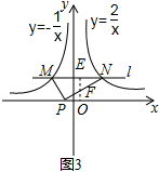 ·ÖÎö £¨1£©ÉèÖ±ÏßlÓëyÖá½»ÓÚµãC£¬·Ö±ð¹ýµãM¡¢N×öMA¡ÍXÖáÓÚµãA£¬MB¡ÍxÖáÓÚµãB£¬¼´¿ÉµÃµ½¾ØÐÎMAOC£¬¾ØÐÎNBOC£¬ÀûÓþØÐεÄÐÔÖʼ°·´±ÈÀýº¯ÊýÖÐkµÄ¼¸ºÎÒâÒå¿ÉÇóµÃ¡÷MONµÄÃæ»ýΪ£¨|-1|+|2|£©¡Â2=$\frac{3}{2}$£¬¼´¿ÉµÃ½â£»£¨2£©ÓÉÖ±Ïßl£ºy=a£¬¿ÉÖªµãMÓëµãNµÄ×Ý×ø±êΪa£¬È»ºó±íʾ³öÆäºá×ø±ê£¬´Ó¶øÇóµÃÏß¶ÎMNµÄ³¤¶È£¬ÒòΪy=aƽÐÐÓÚxÖᣬֱÏßy=-1ƽÐÐÓÚxÖᣬ¹Ê¿ÉÇóµÃMNÉϵĸߵij¤¶È£¬´Ó¶ø¿ÉµÃ¡÷PMNµÄÃæ»ý£¬¼´¿É½â´ð£»£¨3£©ÉèÒÔMNΪֱ¾¶µÄÔ²Ô²ÐÄΪµãE£¬¹ýµãE×öxÖáµÄ´¹Ï߶Σ¬´¹×ãΪF£¬µ±Ô²EÓëxÖáÓн»µãʱ£¬¡ÏMPNÓпÉÄÜÊÇÒ»¸öÖ±½Ç£¬Òò´ËÀûÓÃÖ±ÏßÓëÔ²µÄλÖùØÏµ£¬¼´¿ÉµÃµ½´ð°¸£®