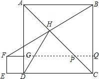 分析 由四边形ABCD、EFGD是正方形,得到EF=DG=DE=1,AB=CD=BC=4,∠E=90°,延长FG交AC于P交BC于Q,得到四边形ECQF是矩形,根据矩形的性质得到FQ=CE=5,CQ=EF=1,证出△BCH≌△DCH,得到BH=DH,又通过△ABH≌△FPH,得到BH=FH,于是得到BH=FH=DH=$\frac{1}{2}$BF,在Rt△BFQ中,BF=$\sqrt{F{Q}^{2}+B{Q}^{2}}$=$\sqrt{{5}^{2}+{3}^{2}}$=$\sqrt{34}$,问题可得.