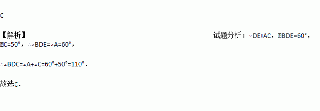 如图,点B是△ADC的边AD的延长线上一点,DE∥AC, 若∠C=50°,∠BDE=60°,则∠CDB的度数等于( )