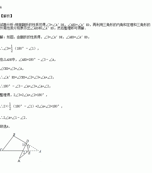 如图,把△ABC纸片沿DE折叠,当点A落在四边形BCED的外部时,则∠A与∠1和∠2之间有一种数量关系始终保持不变,请试着找一找这个规律,你发现的规律是( )