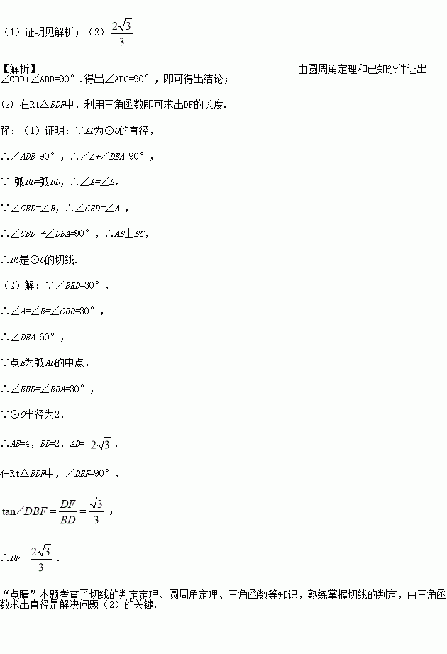 (2)当点E为弧AD的中点且∠BED=30°时,⊙O半径为2,求DF的长度.