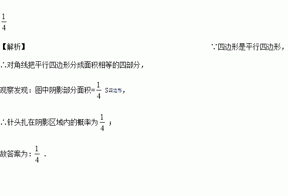 如图所示,平行四边形的两条对角线及过对角线交点的任意一条直线将平行四边形纸片分割成六个部分,现在平行四边形纸片上作随机扎针实验,针头扎在阴影区域内的概率为__________ .