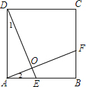 分析 先根据正方形的性质得AB=AD=BC,∠DAB=∠B=90°,则可利用“SAS”判定△DAE≌△ABF,得到DE=AF,∠1=∠2,由于∠1+∠AED=90°,所以∠2+∠AED=90°,根据三角形内角和得到∠AOE=90°,于是得到DE⊥AF.