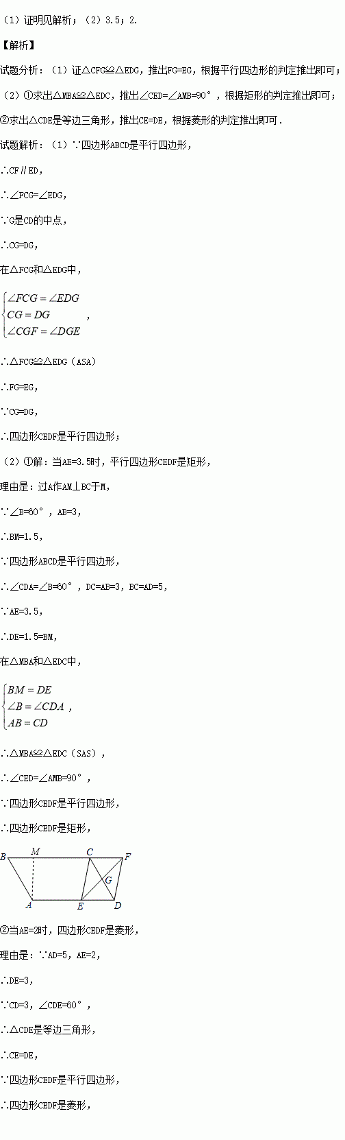 如图,平行四边形ABCD中,AB=3cm,BC=5cm,∠B=60°,G是CD的中点,E是边AD上的动点,EG的延长线与BC的延长线交于点F,连结CE,DF.