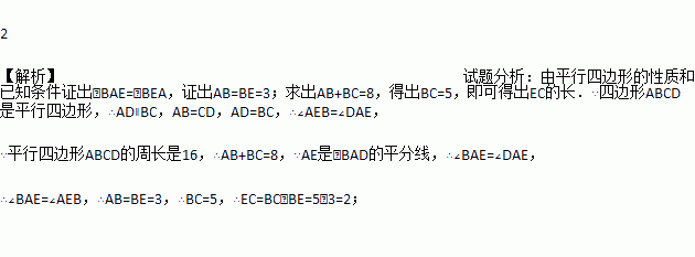 在平行四边形ABCD中,∠BAD的平分线AE交BC于点E,且BE=3,若平行四边形ABCD的周长是16,则EC等于____________.