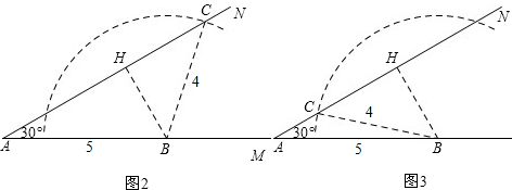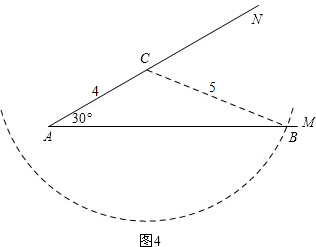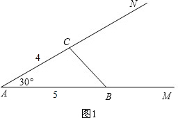 作∠MAN=30°,在AM上取一点B使得AB=5,在AN上取一点C使得AC=4,连接BC,如图1.![]()