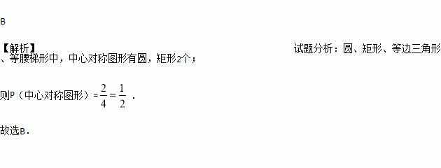 四张质地、大小、背面完全相同的卡片上,正面分别画有圆、 矩形、等边三角形、等腰梯形四个图案.现把它们的正面向下随机摆放在桌面上,从中任意抽出一张,则抽出的卡片正面图案是中心对称图形的概率为
