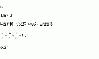 -件工作,甲单独做20 h完成,乙单独做12 h完成,现甲单独做4h后,乙加入和甲一起做,还要几小时完成?若设还要x h完成,则依题意可列方程为( )
