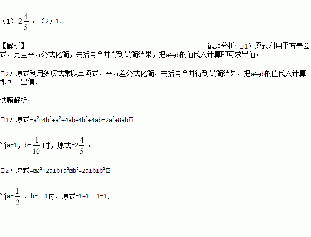 (1)(a+2b)(a﹣2b)+(a+2b)2+4ab,其中a=1,b=