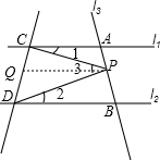 分析 (1)过P作PQ∥l1,根据平行线的性质可求得∠1+∠2=∠3;