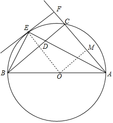分析 由AB=5、AC=3、BC=4可得出∠ACB=90°,以AB为直径作⊙O,则点C、E在圆上,作BC的平行线切⊙O于点E,过点E作EF⊥AC的延长线于点F,此时AF最长,连接OE,过点O作OM⊥AC于点M,根据OE⊥EF、OE⊥EF、EF⊥AF可得出四边形OEFM为矩形,进而可得出MF的长度,再根据点O为AB的中点利用三角形中位线的性质可得出AM的长度,由AF=AM+MF可求出AF的最大值.