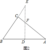 当∠BDE=∠ACB时,如图2,DE交AC于F,![]()