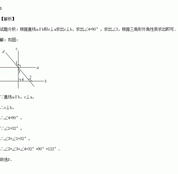 (2015秋•重庆校级期中)已知如图,直线a∥b,c⊥a,∠1=32°,则∠2=( )