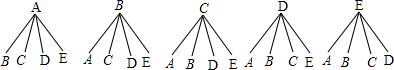 £¨3£©Õâ5¸öÈË·Ö±ðÓÃA¡¢B¡¢C¡¢D¡¢E±íʾ£¬Ð¡Ã÷ºÍС¸Õ·Ö±ðÓÃA£¬B±íʾ£¬Èçͼ£º![]()