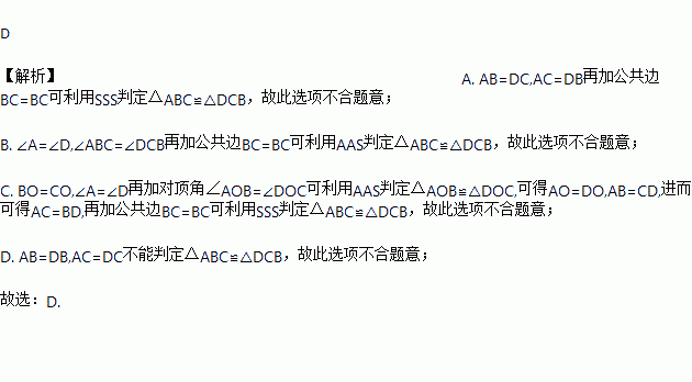 A. AB=DC,AC=DB B. ∠A=∠D,∠ABC=∠DCB