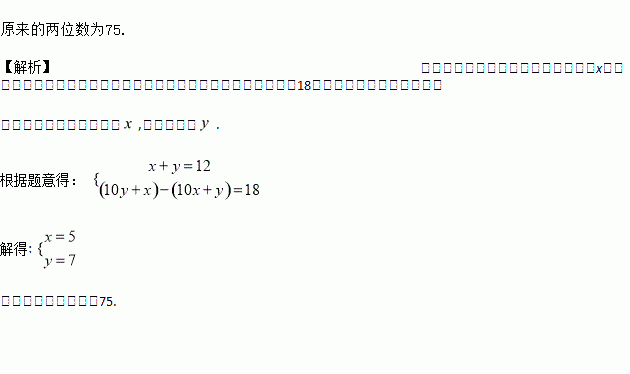已知一个两位数,它的十位上的数字与个位上的数字的和为12,若对调个位与十位上的数字,得到的新数比原数小18,求原来的两位数。